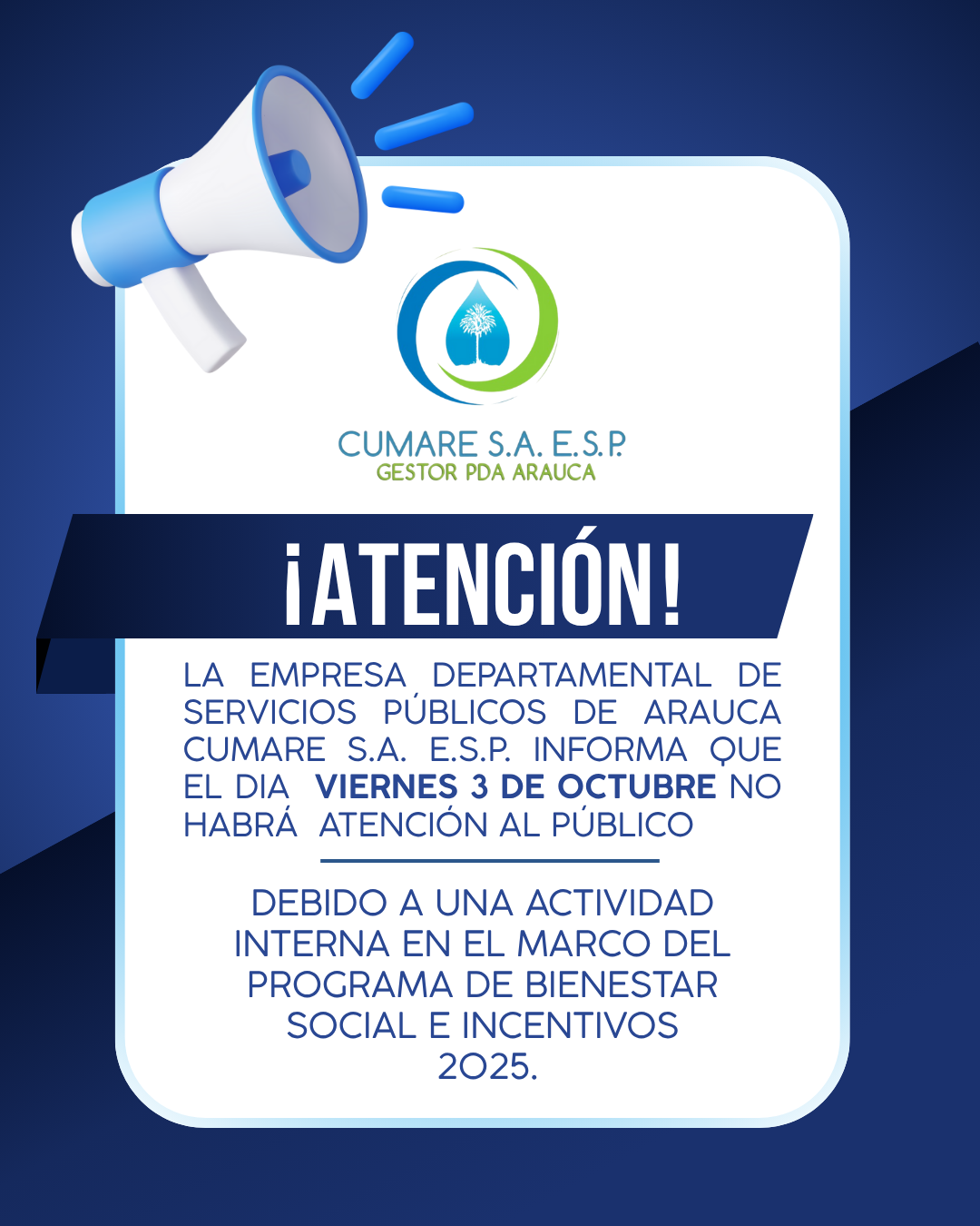 La Empresa Departamental de Servicios Públicos CUMARE S.A. E.S.P. informa que, en el marco del Programa de Bienestar Social e Incentivos 2025, no habrá atención al público el viernes 3 de octubre. Agradecemos su comprensión. Leer más…