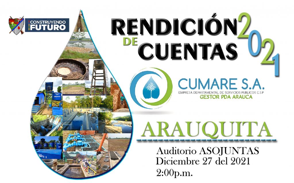 La Empresa Departamental de Servicios Publicos de Arauca #Cumare S.A E.S.P, Invita a Toda la Comunidad del Departamento de #Arauca a Participar en la Rendición de Cuentas Vigencia 2021; que tendrá lugar el día 27 de Diciembre en el Municipio de #Fortul a las 8.30a.m. En el Auditorio de EMCOAAAFOR ESP. y en el Municipio de #Arauquita a partir de las 2:00p.m. en el Auditorio de ASOJUNTAS.