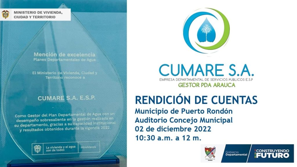 En cumplimiento con el artículo 50 de la Ley 1757 de 2015, la Empresa Departamental de Servicios Públicos de Arauca #CUMARE SA ESP, invita a prestadores de servicios públicos de Acueducto, Alcantarillado y Aseo y a la comunidad en general del departamento de #Arauca, a la primera Rendición de Cuentas de la vigencia 2022, a llevarse a cabo en el municipio de #PuertoRondón, auditorio del Concejo municipal, este 02 de diciembre desde las 10 y 30 am. El objetivo de la reunión es informar y explicar la gestión realizada, así como los resultados obtenidos durante esta vigencia por parte de CUMARE SA ESP.