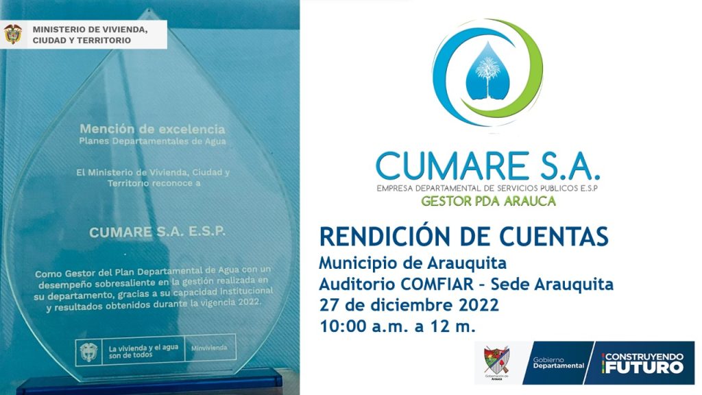 En cumplimiento con el artículo 50 de la Ley 1757 de 2015, la Empresa Departamental de Servicios Públicos de Arauca CUMARE SA ESP, invita a prestadores de servicios públicos de AAA y a la comunidad en general del departamento de Arauca, a la primera Rendición de Cuentas de la vigencia 2022, a llevarse a cabo en el municipio de Arauquita, auditorio COMFIAR este 27 de diciembre desde las 10:00 am. El objetivo de la reunión es informar y explicar la gestión realizada, así como los resultados obtenidos durante esta vigencia por parte de CUMARE SA ESP.